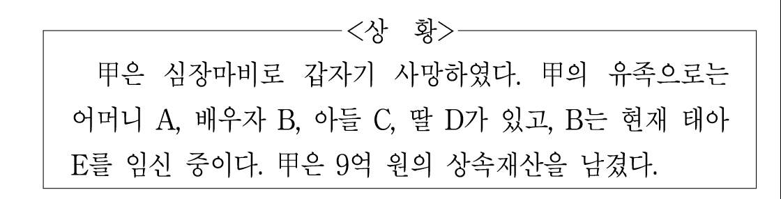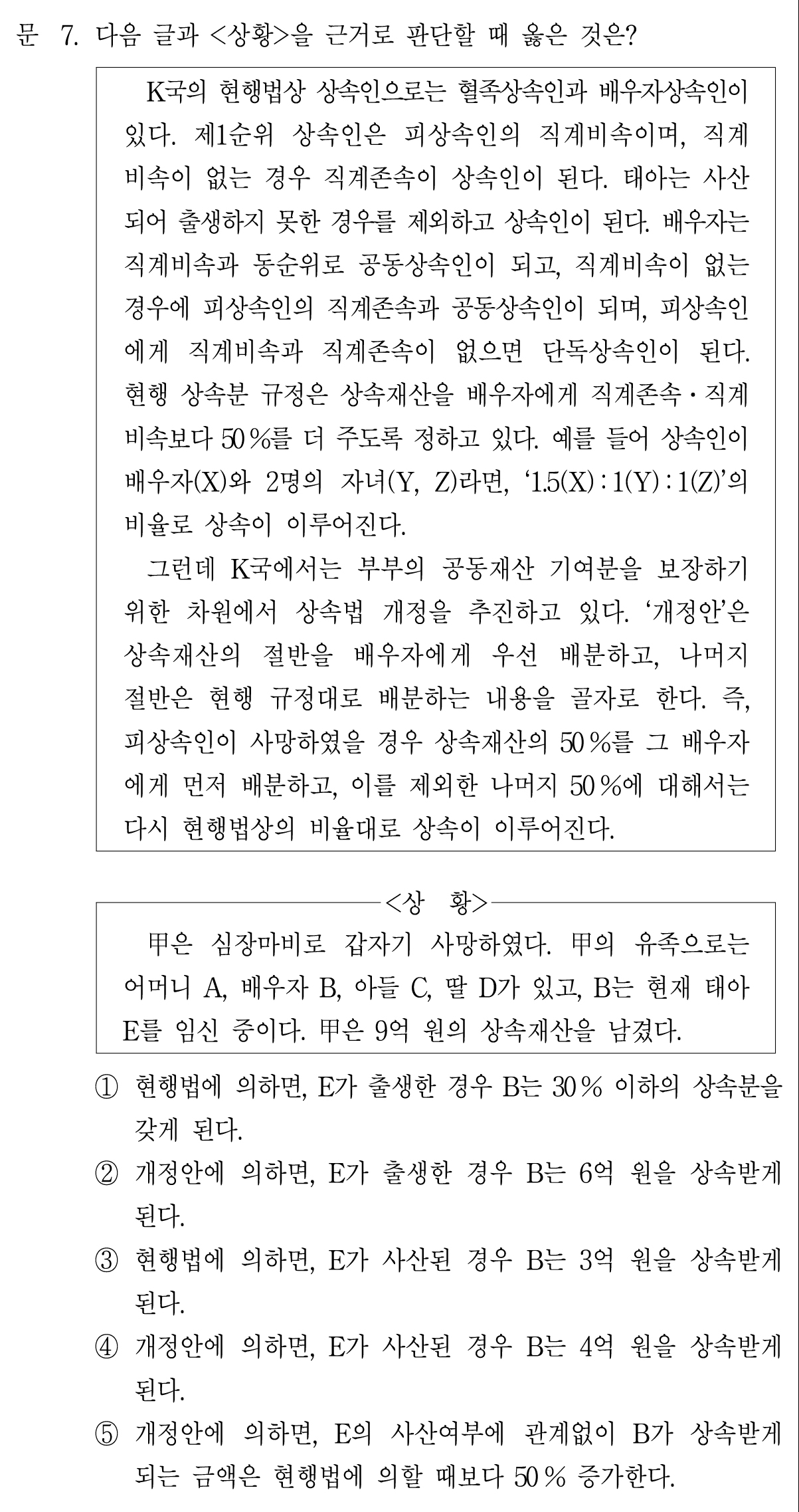 5. 개정안에 의하면, E의 사산여부에 관계 없이 B가 상속받게 되는 금액은 현행법에 의할 때보다 50% 증가한다.