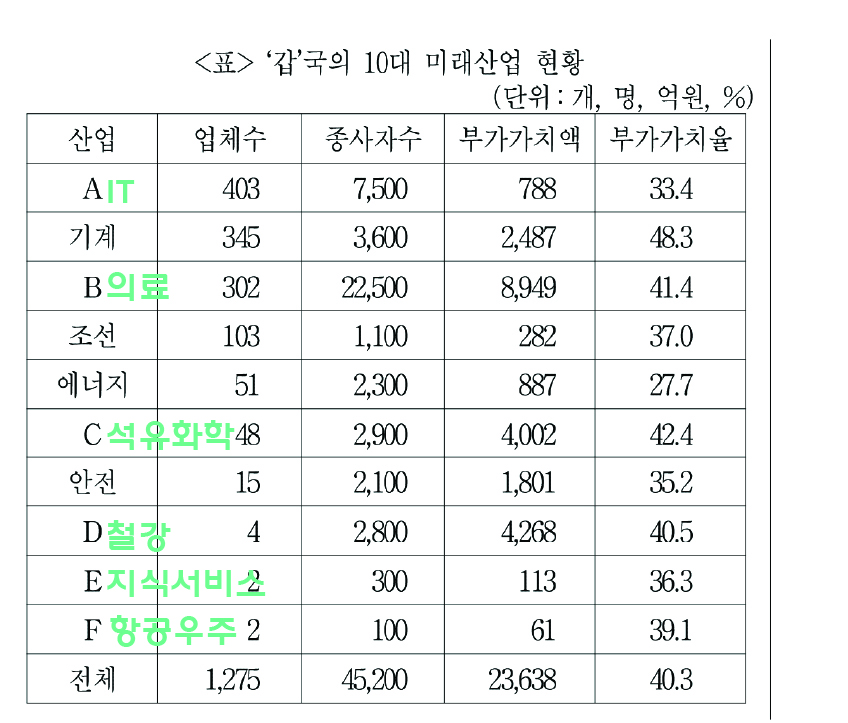 의료와 석유화학의 부가가치액 합은 10대 미래산업 전체 부가가치액의 50% 이상이다.