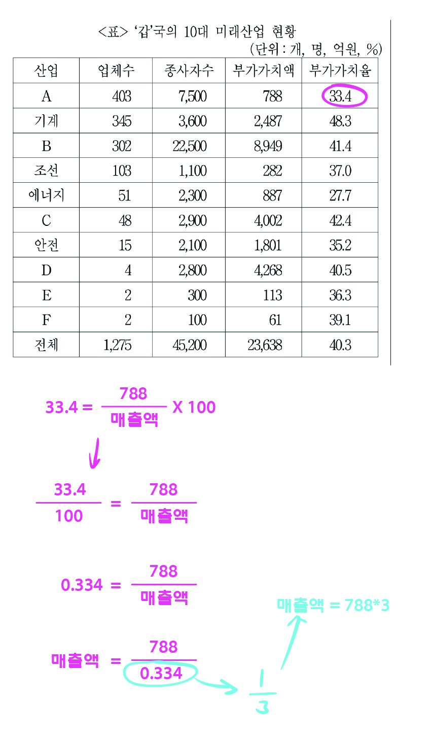 그래서 부가가치액인 788에 3을 곱하면 A의 매출액이 나오는 것이다.