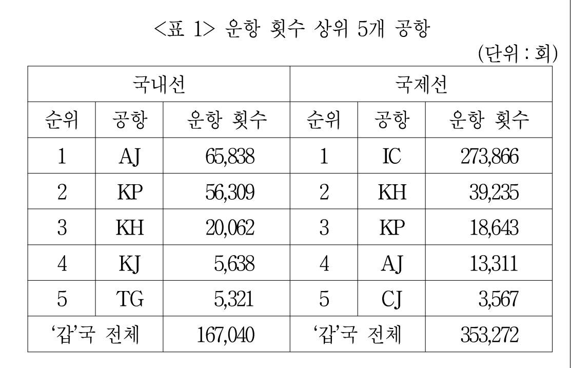 일단, <표1>을 보면 상위 5개 공항에서 국제선 목록을 확인할 수 있다.