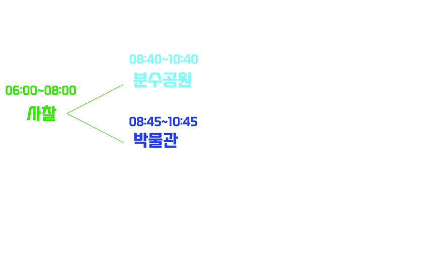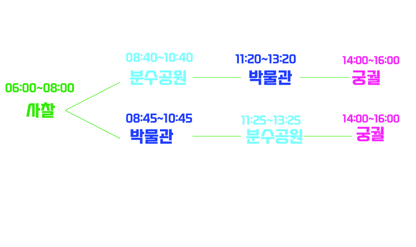 위 도식을 보면 사찰 관광 이후에 분수공원부터 가든, 박물관부터 가든, 종료 시각이 16시로 동일하기 때문에 바뀌어도 상관 없다.