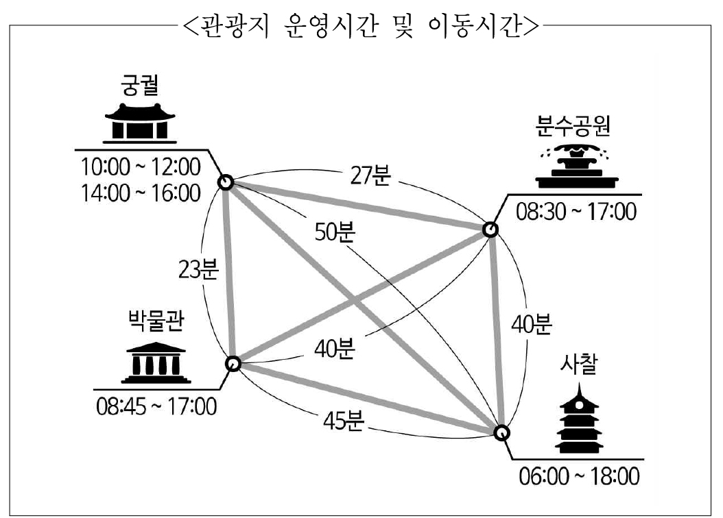 각 관광에 소요되는 시간은 2시간이며, 관광지 운영시간 외에는 관광할 수 없다