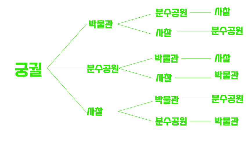 사찰-분수공원-박물관 코스로 가면 궁궐 도착시간은 13:43이 된다. 나머지 17분은 휴식한다 치고 14:00에 궁궐에 들어가면 관광 종료 시각은 16시가 된다.