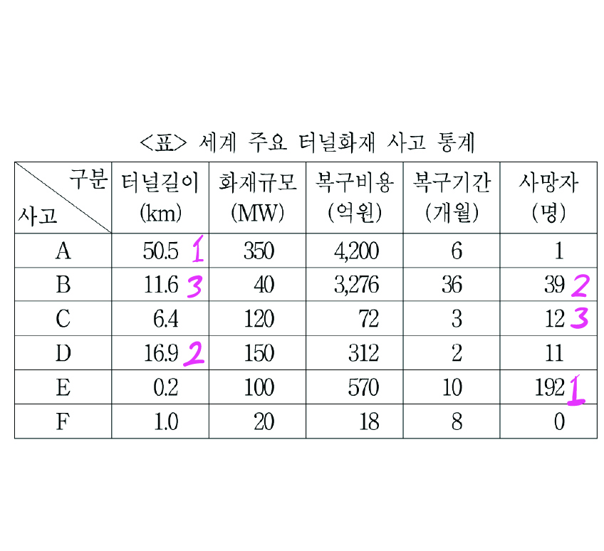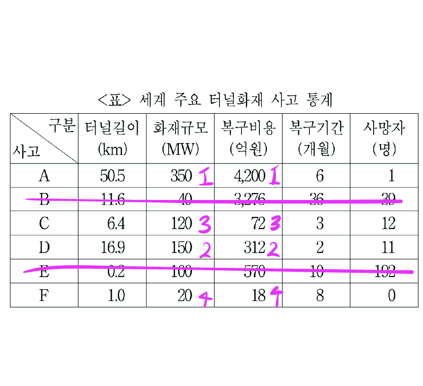 사망자가 30명 이상인 사고를 제외하면 B와 E는 빼야 한다.