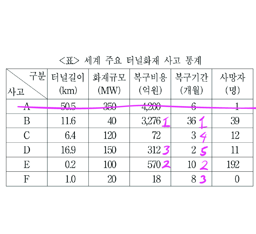 4번. 사망자가 가장 많은 사고 E는 사고비용도 가장 크다.