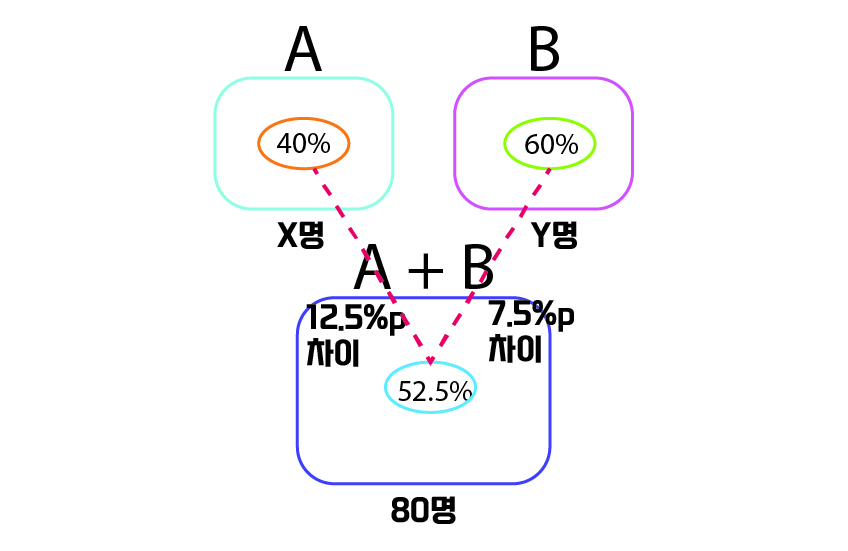 A의 평균 점수인 40%와 A+B의 평균 점수인 52.5%는 12.5%p 차이가 난다.