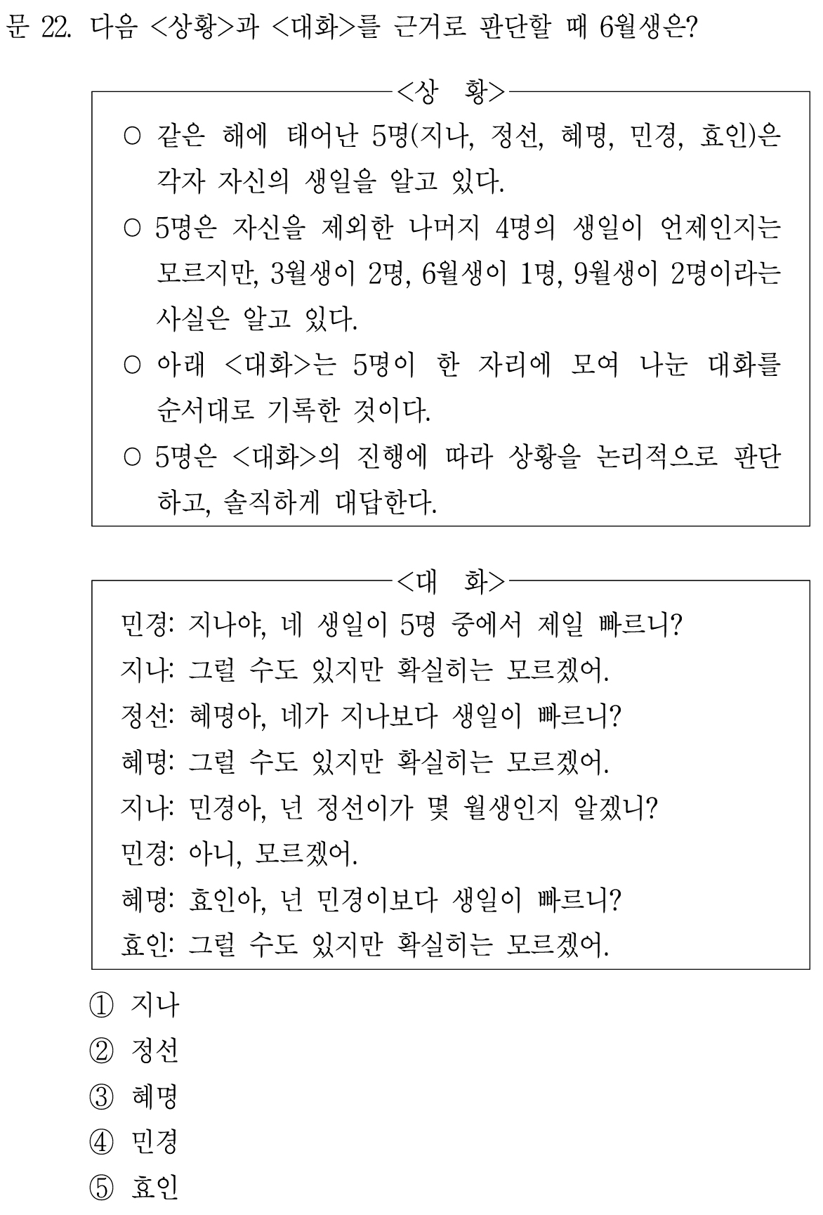 본인이 6월생이라면 남은 세 사람 중 생일이 가장 빠르다는 것을 알 것이다.