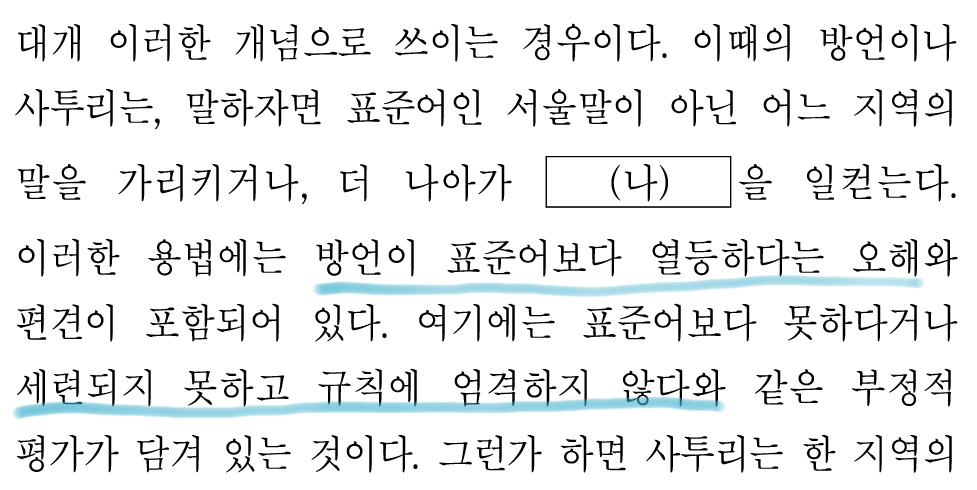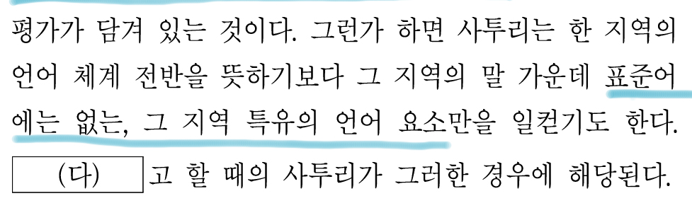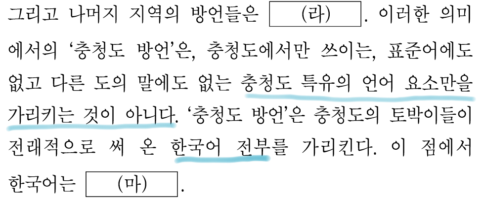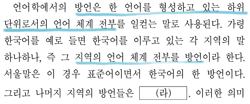 '그 지역의 언어 체계 전부를 방언이라 한다.'에서 (라)에 '언어 체계 전부'라는 내용이 들어가야 한다고 생각했다.