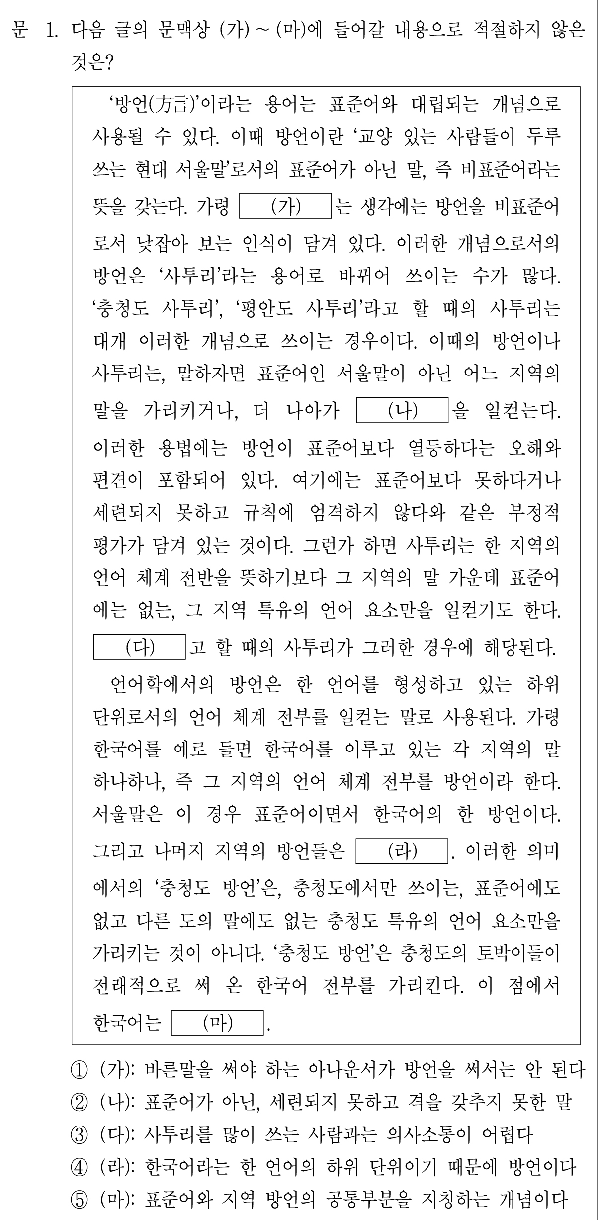 (마)에는 표준어와 방언이 본질적으로 다르지 않다는 내용이 들어가야 한다.