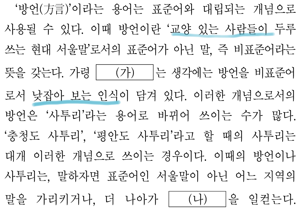 그래서 (라)에 '한국어라는 한 언어의 하위 단위이기 때문에 방언이다'가 적절한 것이다.