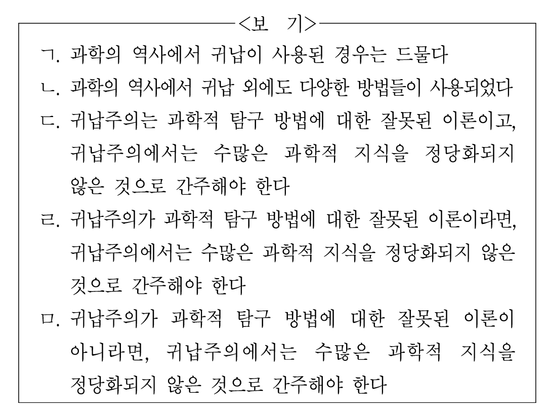 ㅁ. 귀납주의가 과학적 탐구 방법에 대한 잘못된 이론이 아니라면, 귀납주의에서는 수많은 과학적 지식을 정당화되지 않은 것으로 간주해야 한다.