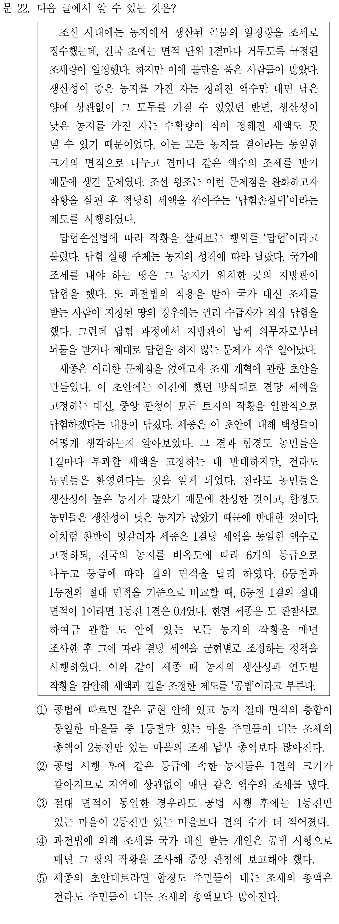 전라도 땅의 생산성이 더 높으므로 전라도에서 함경도보다 더 높은 등전을 부여 받게 된다는 것을 고려하면