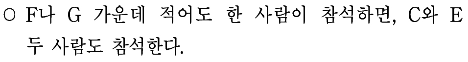 'C와 E 적어도 한 사람이 참석하지 않으면 F와 G는 참석하지 않는다.'가 된다.