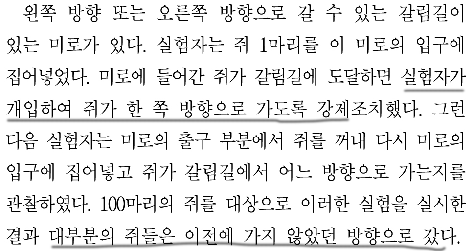 실험자가 개입해서 오른쪽으로만 가게 하거나 왼쪽으로만 가게 '강제'한 것이다.