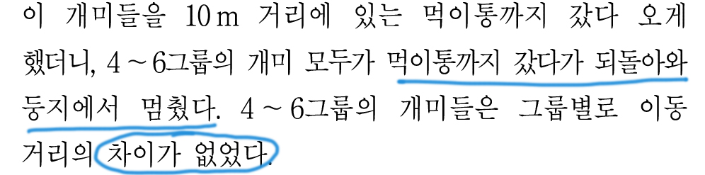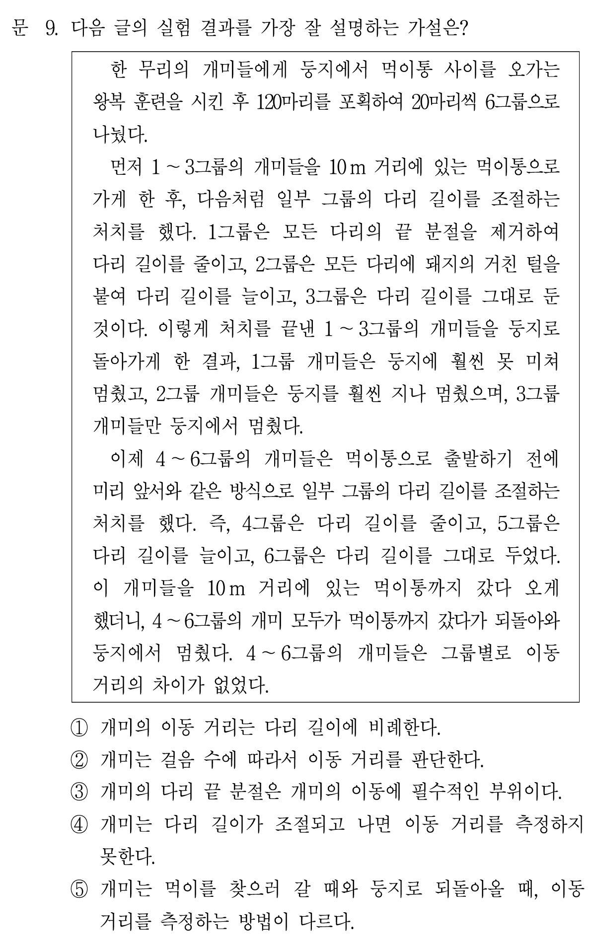 5번. 개미는 먹이를 찾으러 갈 때와 둥지로 되돌아올 때 이동 거리를 측정하는 방법이 다르다.