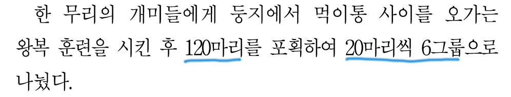 1 그룹의 경우, 먹이통까지 A 만큼 걸음 수가 있었다고 하면