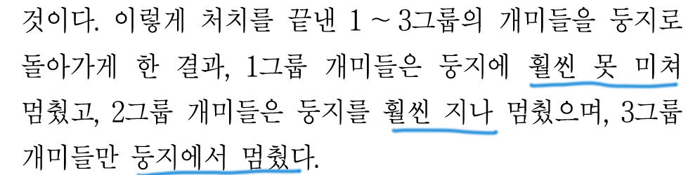 1 그룹의 경우, 먹이통까지 A 만큼 걸음 수가 있었다고 하면