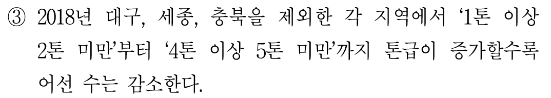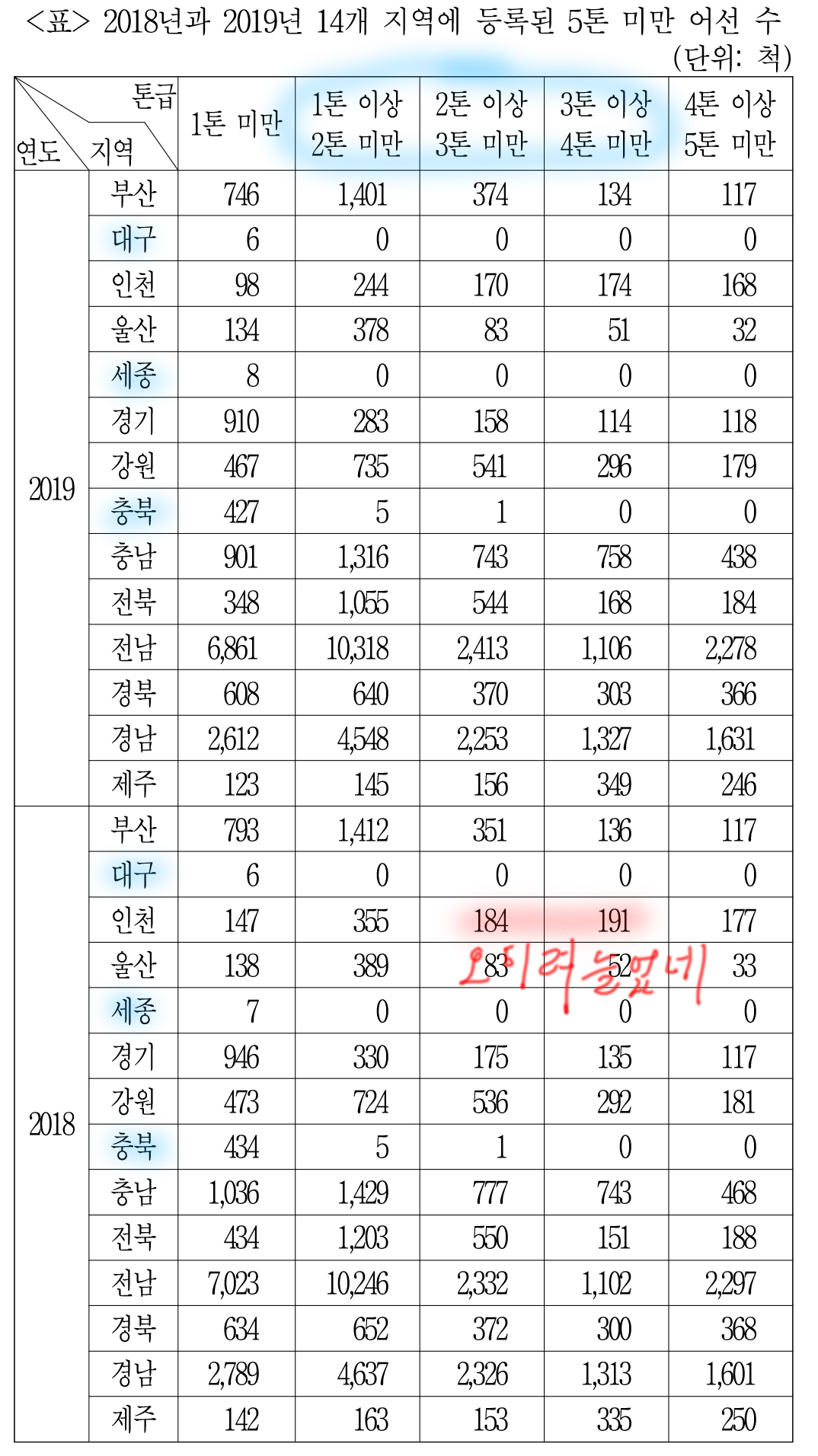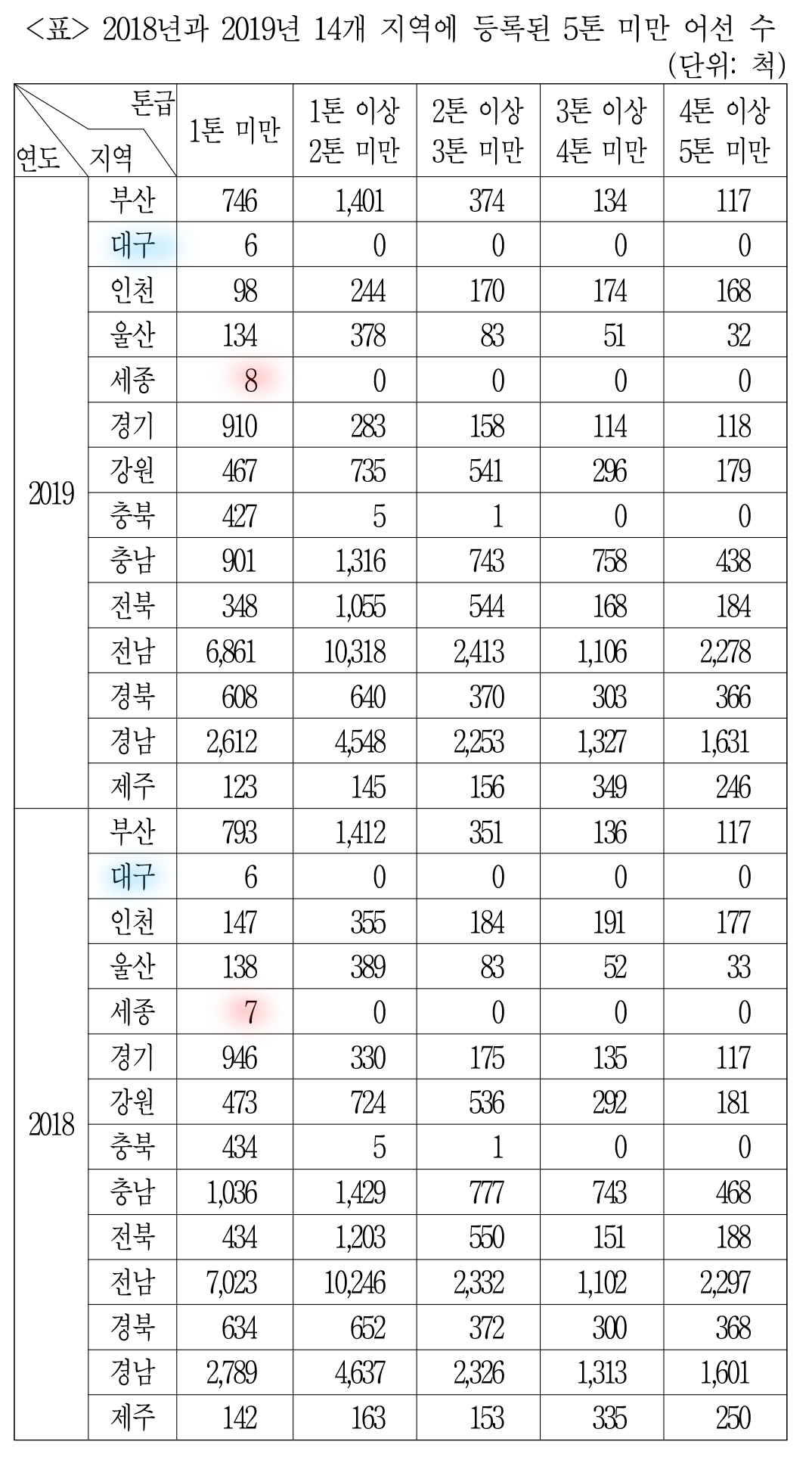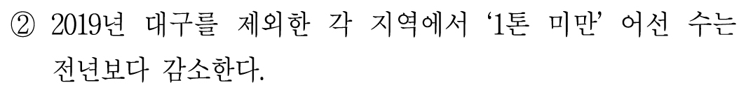 대구 빼고 다 전년도 대비 '1톤 미만' 어선 수가 다 줄어들었느냐인데,