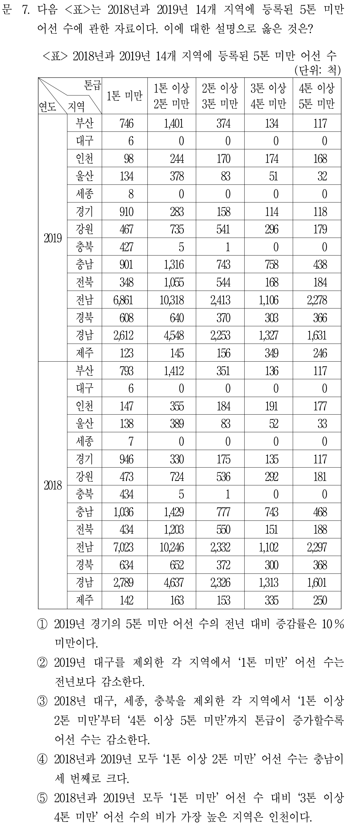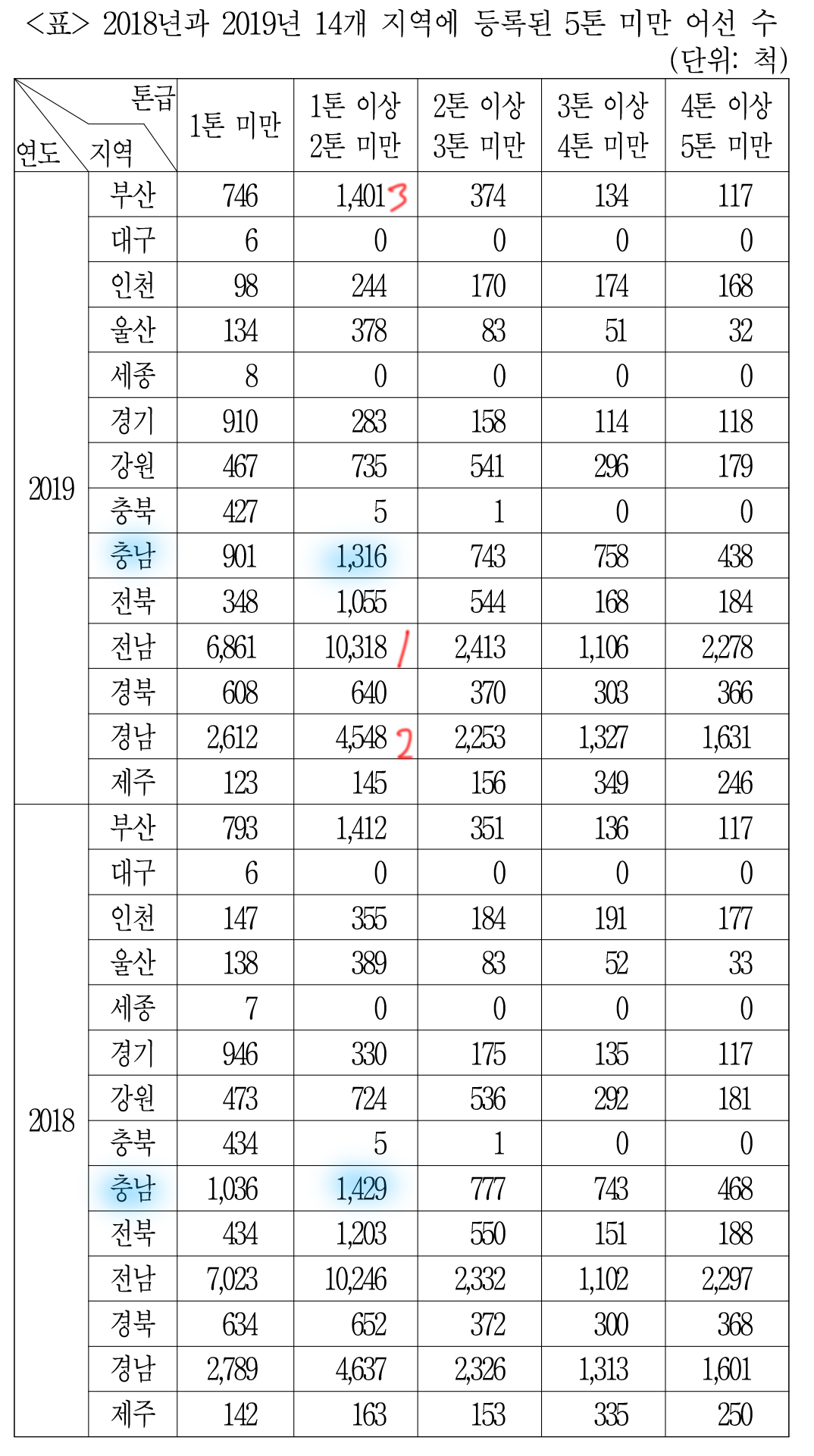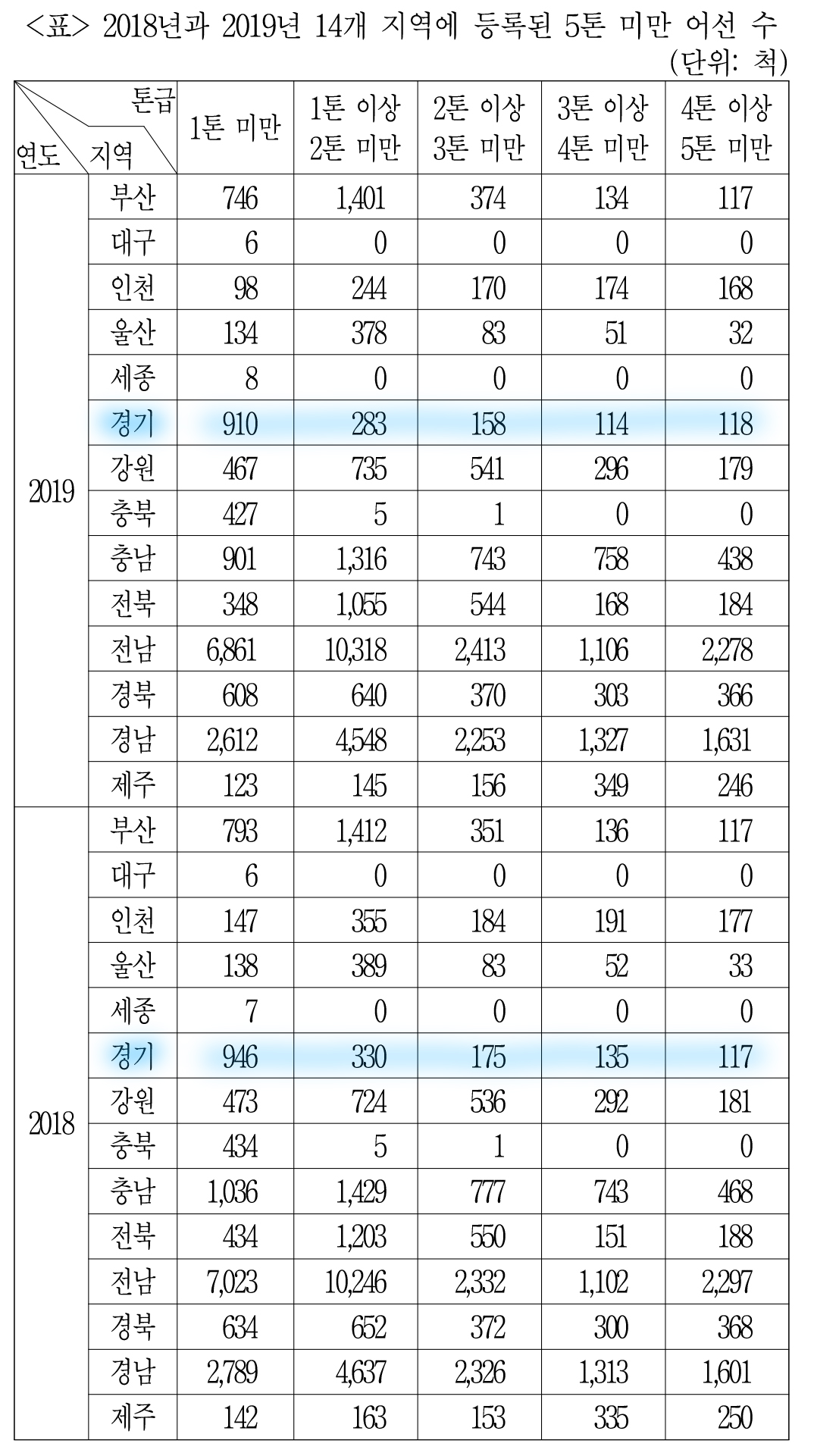 대구 빼고 다 전년도 대비 '1톤 미만' 어선 수가 다 줄어들었느냐인데,