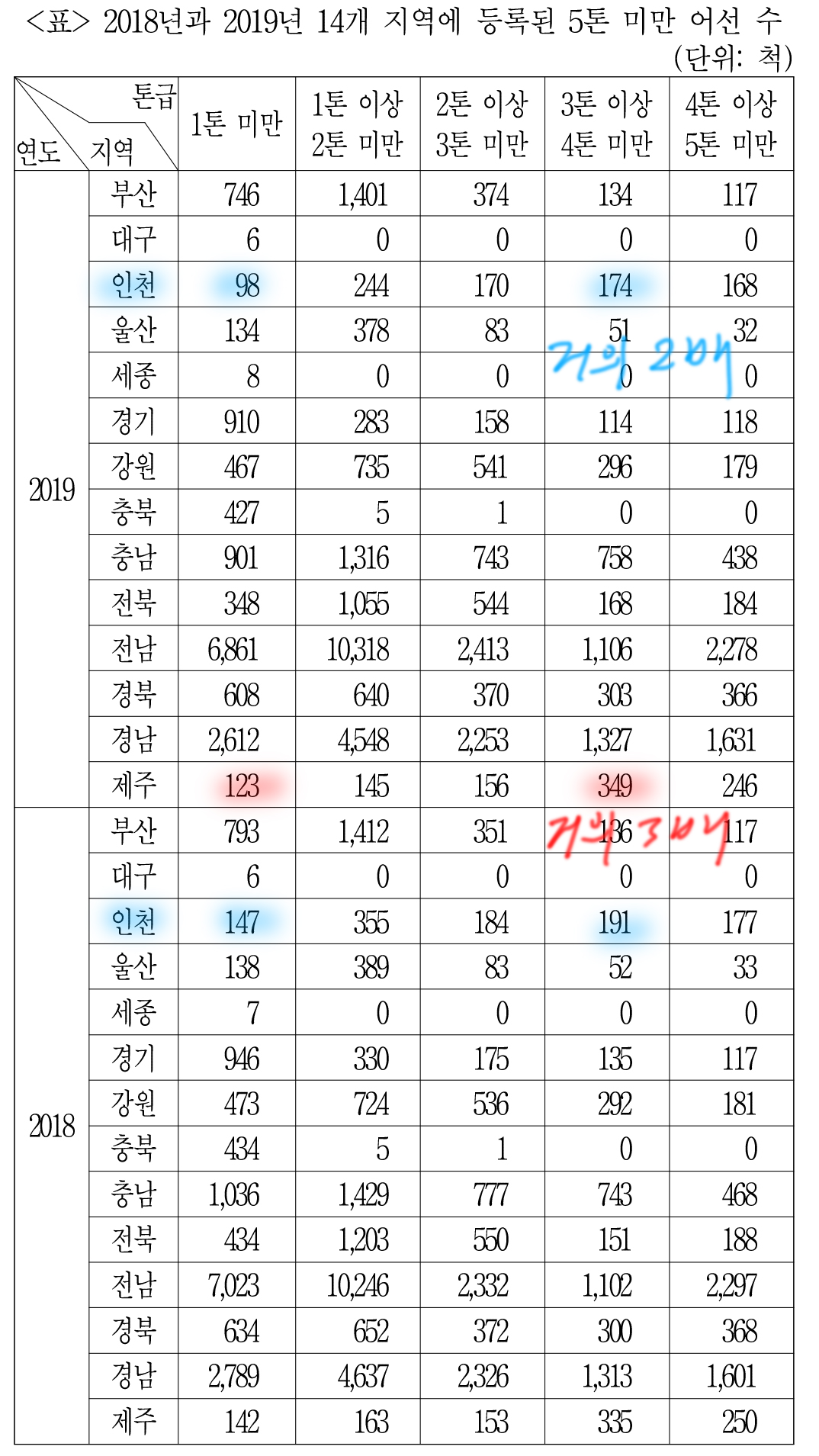 대구 빼고 다 전년도 대비 '1톤 미만' 어선 수가 다 줄어들었느냐인데,