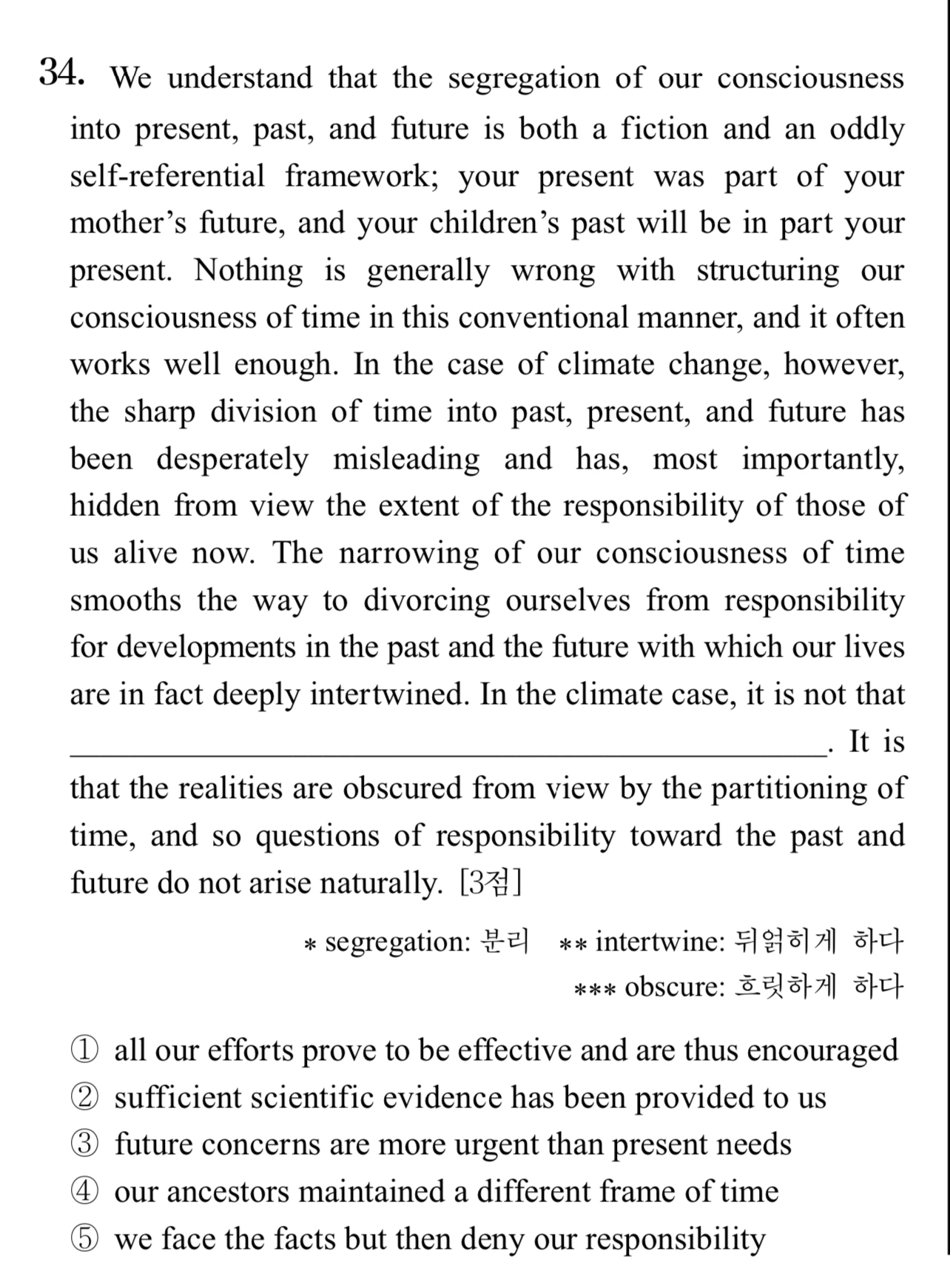 과거, 현재, 그리고 미래라는 시간을 구분해 놓음으로써 우리가 책임을 쉽게 회피한다는 것이다.