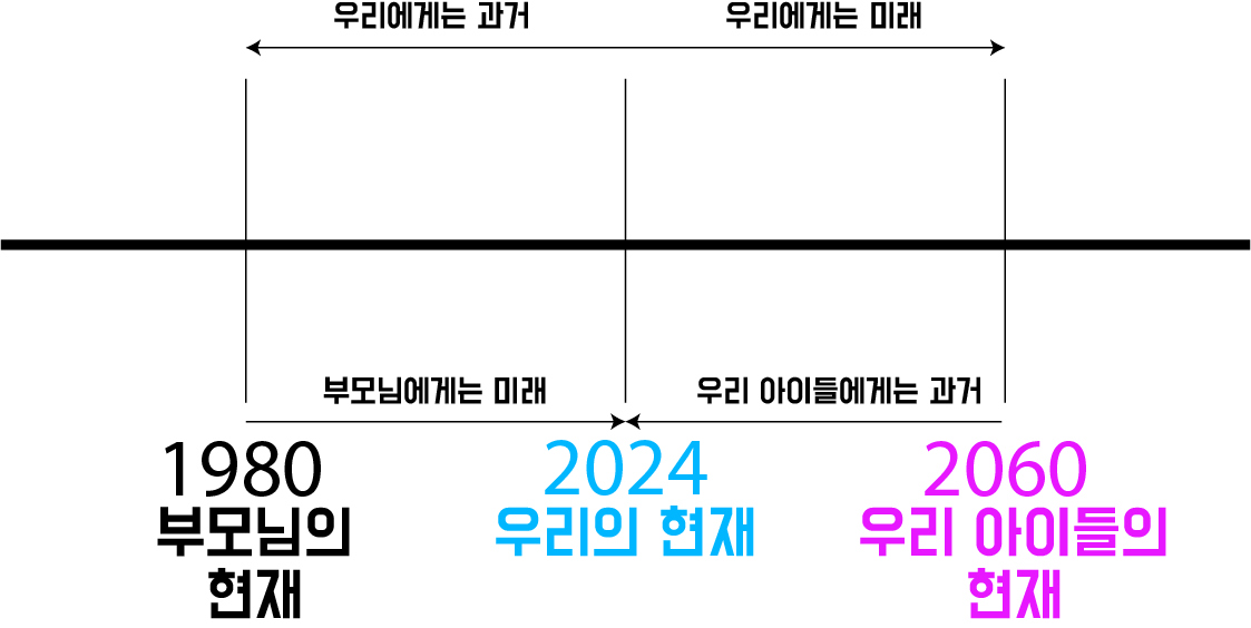 그러니까 '우리는 우리 부모님의 미래에서 사는 동시에 우리 아이들의 과거에서 살고 있다'고 하는 것이다.