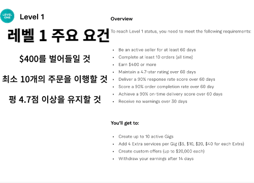 현재는 리뷰가 40개 쌓였고 레벨 1셀러로 레벨업한 지 일주일이 지났습니다. 이제 레벨 2 요건도 만족시켜서 다음 달에 레벨 2로 레벨업할 예정입니다. 아직은 갈 길이 너무 멀지만 계속해서 리뷰 쌓고 클라이언트들에게 가치를 주는 셀러로 활동할 예정입니다.
