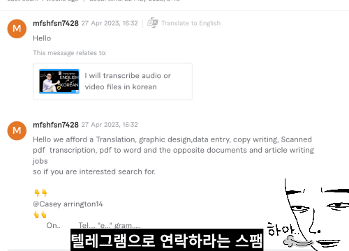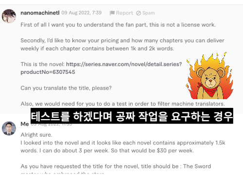 그 전까지는 이런 사기 문의만 계속 들어왔었는데 말이죠. 특히 3번은 아직도 생각하면 화나는 것이, 초보 셀러여서 아직 실력을 증명해 보일 작업이 없는 것을 이용해서 테스트를 통해 실력을 파악한 다음에 만족스러우면 작업을 주겠다고 합니다. 저는 당시 아무것도 몰랐기에 대뜸 알았다고 하고 테스트를 했는데, 약 1300자? 쯤 되더라고요. 이 정도면 지금 기준으로 한 $20 받을 양인데 이를 번역하고 나니 바로 연락이 없더라고요.