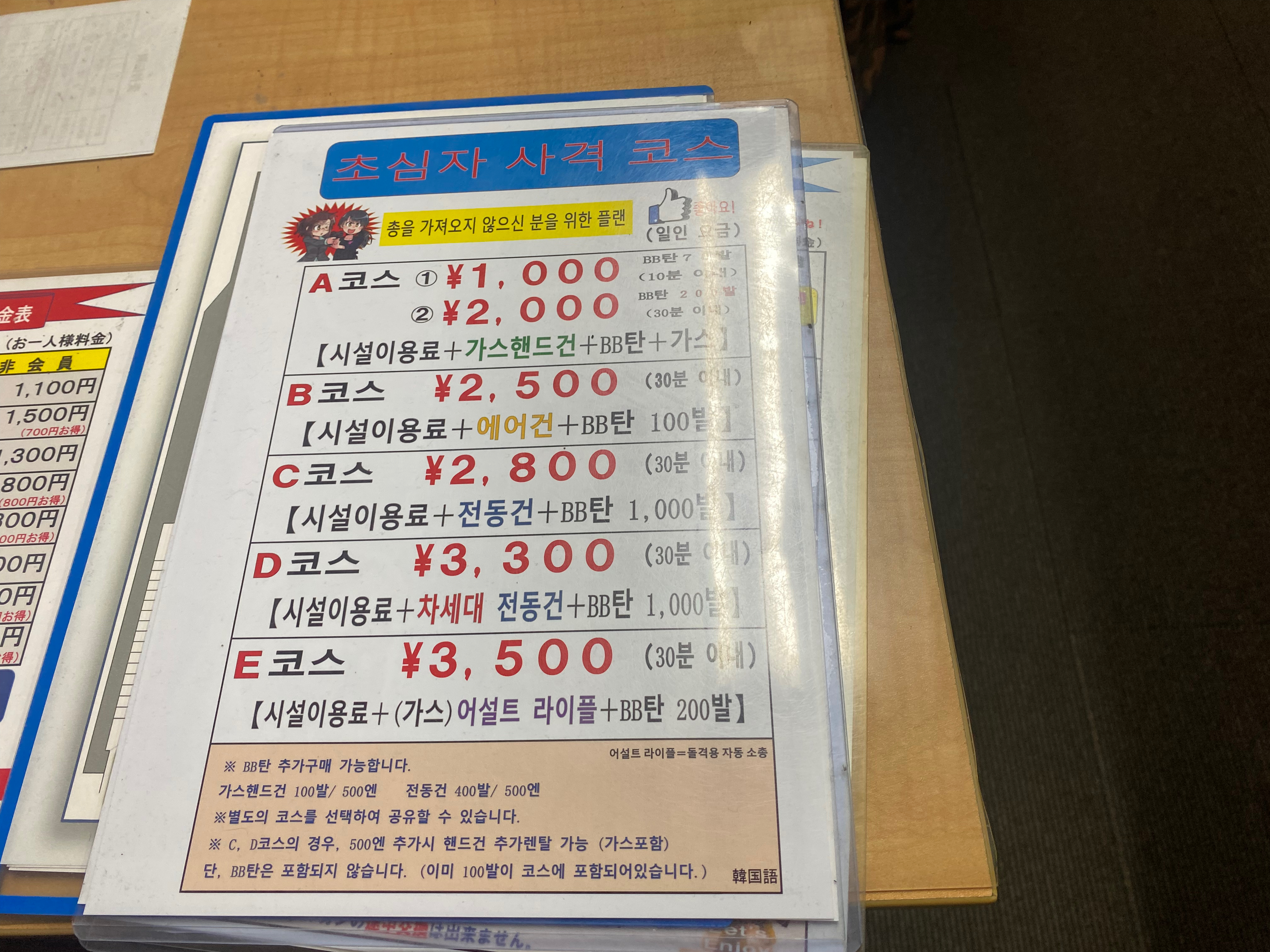 처음에 가격표를 봤을 때는 '아 참 비싸다'라는 생각이 앞섰는데, 지금 생각해보니 그런 것도 아닌 것 같다. 제일 저렴한 것이 만원정도 하는데, 이는 BB탄 권총 70발을 쏠 때다. 한국에서도 20발 정도 사격한다고 하면 한 4천원 정도 냈던 것 같은데, 그걸 생각하면 저렴한 것 같다.